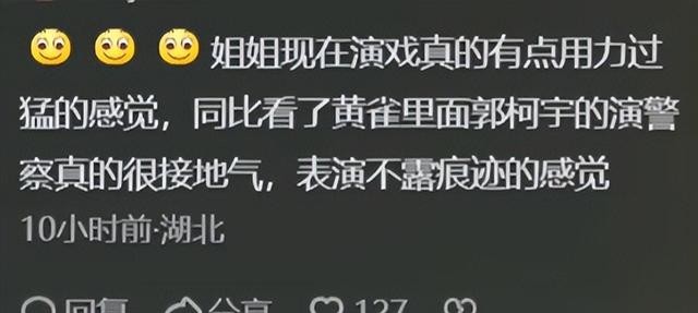 “姐姐现在演戏真的有点用力过猛的感觉,同比黄雀里面的郭柯宇饰演的警察就很接地气”。