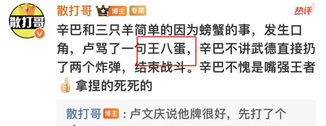 根据散打哥的发声微博来看,辛巴只因卢总的一句谩骂,直接丢出两个炸弹结束战斗,说辛巴是妥妥的嘴替王者。