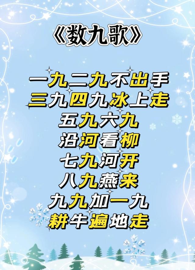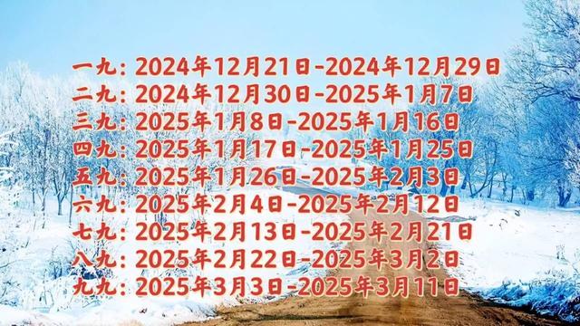 2024年数九时间表数九又称“冬九九”,是我国民间一种计算寒天与春暖花开日期的方法。它从冬至日(通常是每年公历12月21日至23日之间)开始算起,每九天算一“九”,依此类推,直至数到九个“九天”,即九九八十一天,那时便春深日暖、万物生机盎然,是春耕的时候了。(下图为2024年数九时间表)