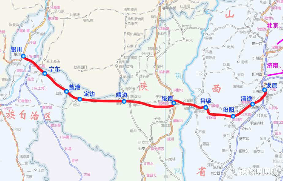其次来讲青银通道中的银川至绥德高速铁路。作为青银通道(青岛—银川)西段的重要组成部分,银川至绥德全长约420公里,设计时速350公里。线路规划西起银川市,跨黄河东行,经苏银产业园、宁东能源基地、盐池县进入陕西省北部,然后沿既有太中银铁路通道延伸,接入绥德西站,与在建的延安至榆林高铁衔接。不过由于榆林市目前在争取太绥高铁经过榆林中心城区,因此未来银川至绥德高铁是何走向,还需统筹研究论证。