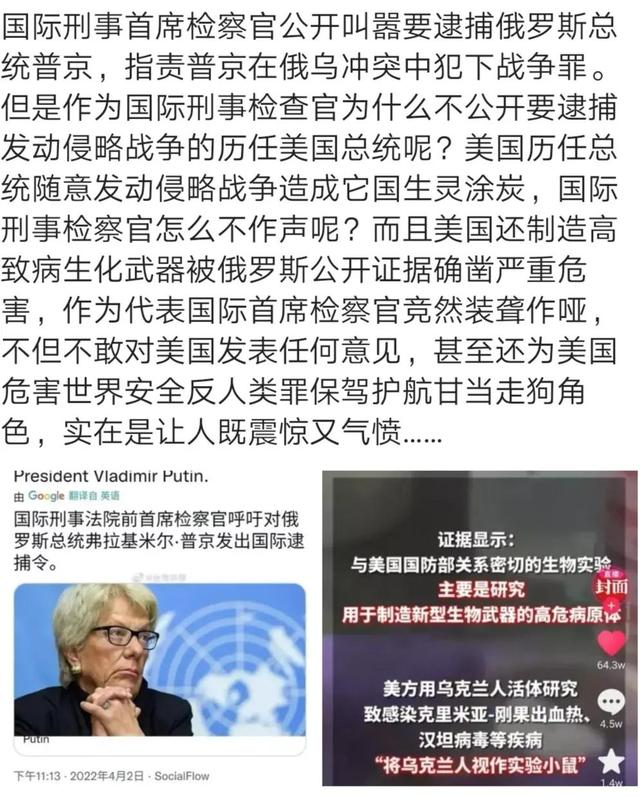 仔细看,乌克兰警察部队4月2日公布所谓的"布查屠杀",同日所谓国际刑事法院前首席检察官就立刻宣称要对俄总统普京发国际逮捕令!这难道不是串通好的?