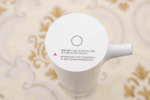诗杭自动感应洗手机的电源开关设计在了顶部,采用的是触摸式设计,轻触开关机,圆圈的LED指示灯,白色表示进入待机状态、橘灯表示进入关机转态,采用低功耗技术,四节干电池可以使用半年之久。