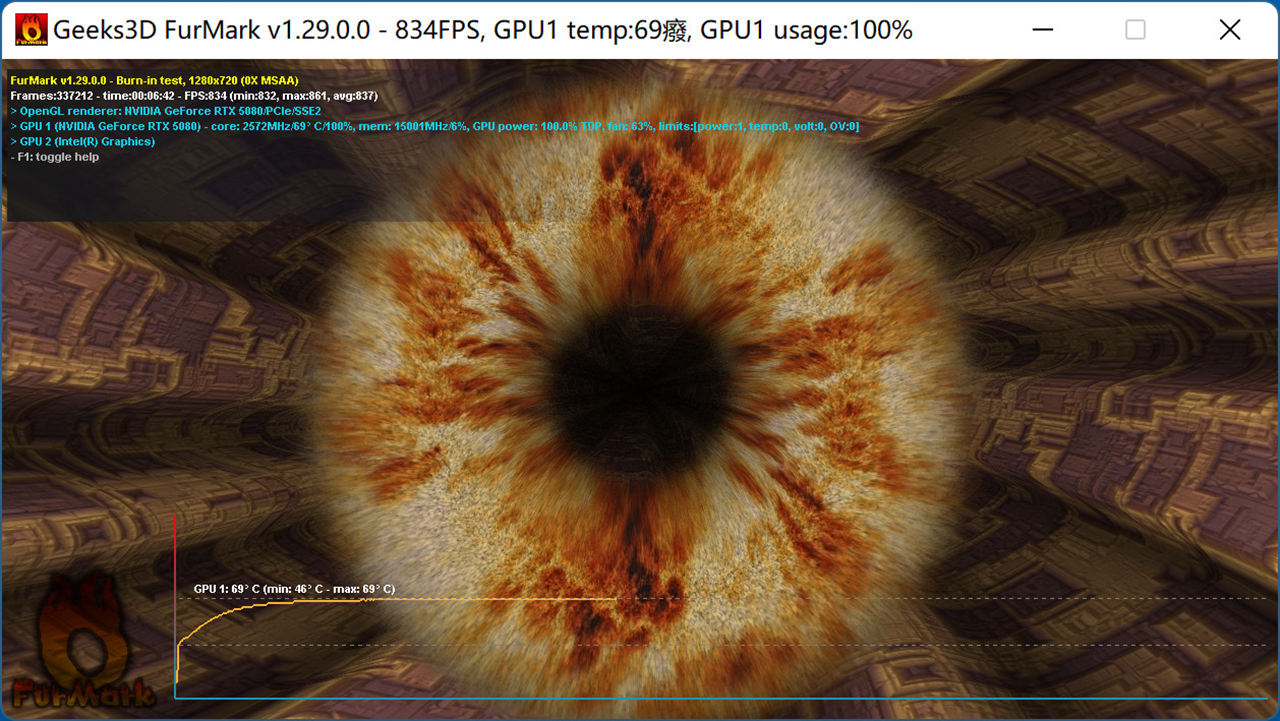 GPU采用FurMark烤机5分钟后,核心最高温度为69℃,这温度控制也非常给力了。