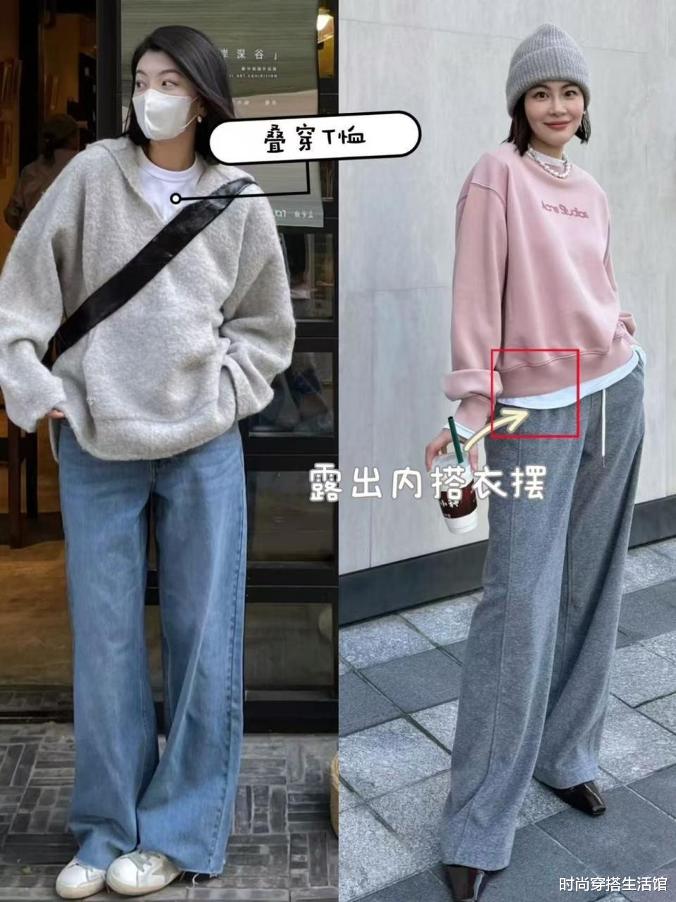 上装首当其冲被淘汰的是不减龄又显胖的卫衣,下装最值得抛弃的就是小黑裤了。看对比就知道为何年龄越大越别穿打底裤~