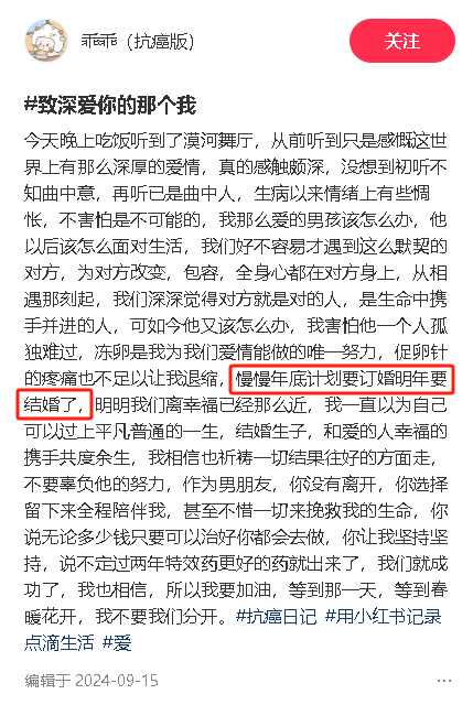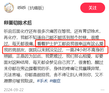 从她发的所有动态中,我们都能看出,她男朋友真的很爱很爱她,就连护士和护工都止不住地总是夸赞他男朋友,说从来没见过能24小时不离身照顾的男朋友。