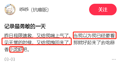 要说最让人揪心的,还是文案,她说就在自己已经要看见天堂的时候,又被拽回来了,足以见得,她已经非常痛苦,但即便是这样,她依然有一个好的心态,她相信自己能好起来,还说等好起来了就去吃蒜香小龙虾。