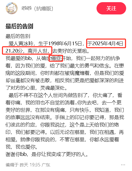 而发布这一消息的,便是她的男朋友,从“告别”的那段话中我们可以知道,黄冰玲是因癌症去世的。