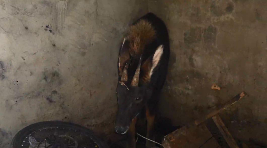 这一看可把村民吓了一跳,只见一只长相非常奇特的野生动物,赫然出现在自家猪圈里面。它体型不小,像一只小牛犊。眼神惊恐,见人们的到来,就往角落里躲。