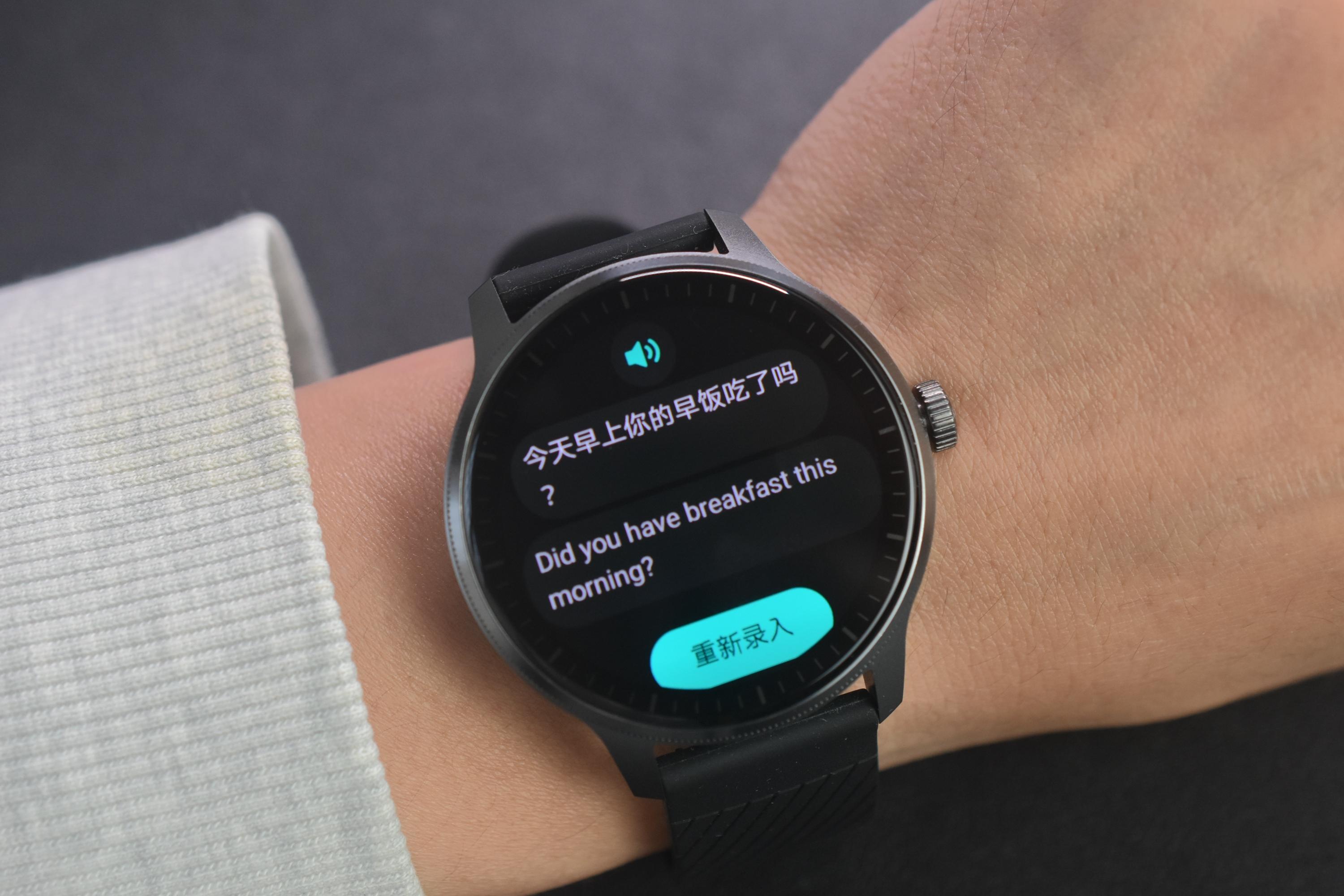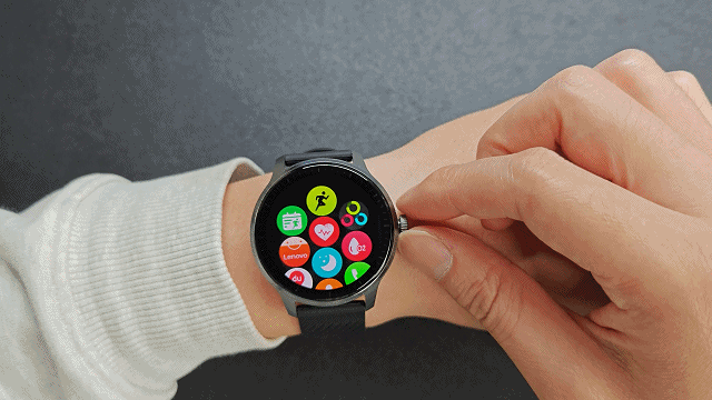 联想智能手表搭载的是Wearfit OS智能手表操作系统,它完美地将健康、运动、生活、出行等多元化需求融入到一个智能穿戴操作系统中。虽然是第一次使用这款操作系统,但能明显感受到操作的流畅。表盘下滑为快捷菜单键,上滑可读取APP通知、微信语音文字,左右滑动可循环切换运动数据、心率监测、天气预报、睡眠数据音乐播放、语音助手。