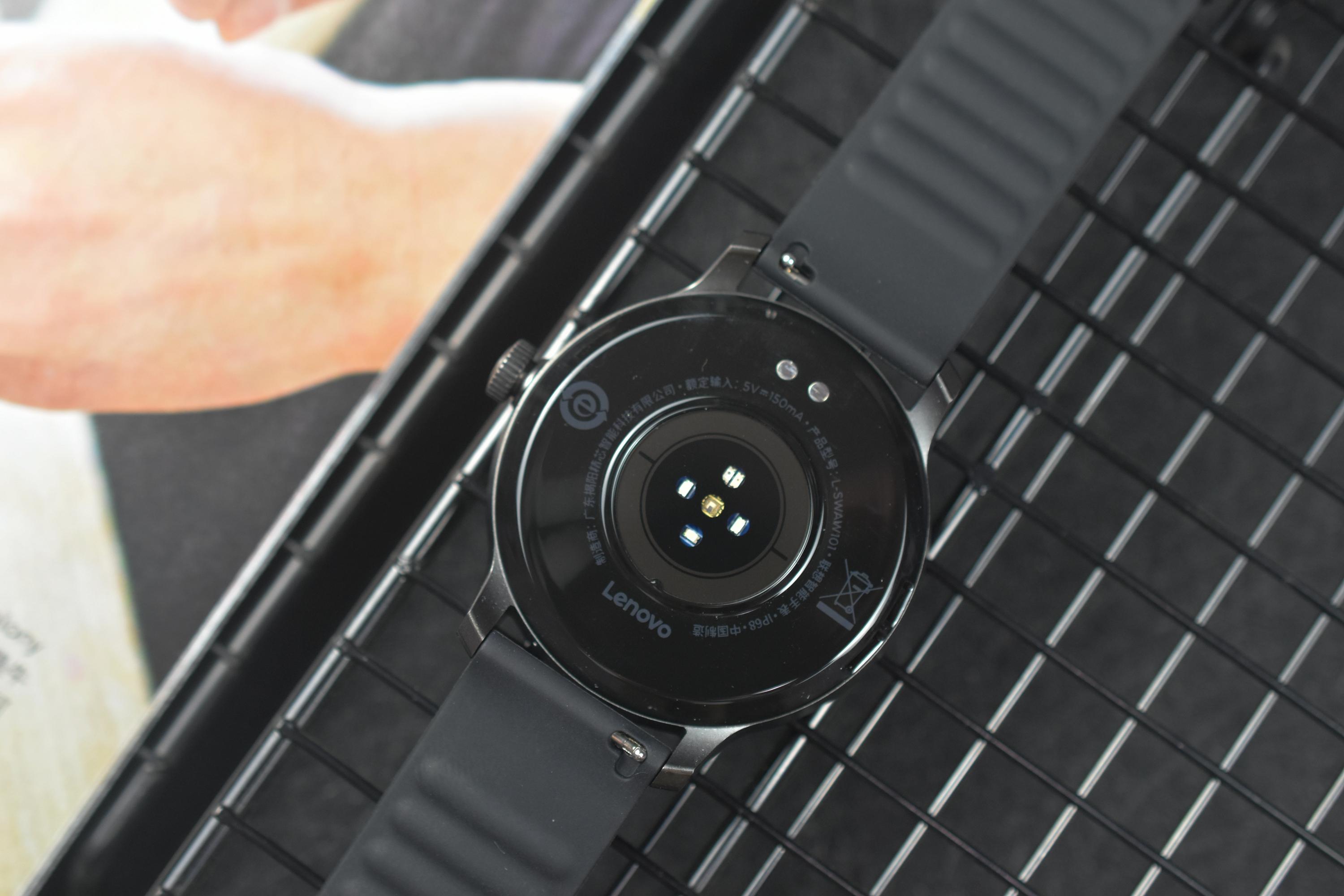联想智能手表的背面做得也相对平整,整个心率感应区也仅比背面略微高出一些。它内置的这颗生物追踪光学传感器,支持心率、血氧、呼吸等多项监控指标监测,心率检测时传感器显示绿色,血氧浓度检测时传感器显示红色,可以提供全天候心率、睡眠监测、零星小睡记录等监控。