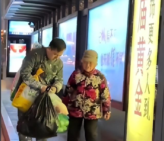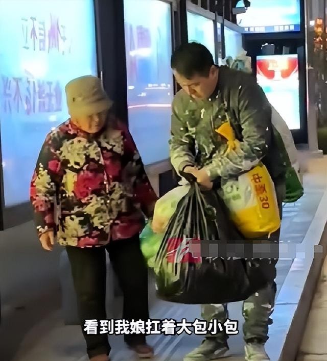 儿子40多岁,匆匆赶到车站后,赶忙接过妈妈手里的包裹扛在自己身上。