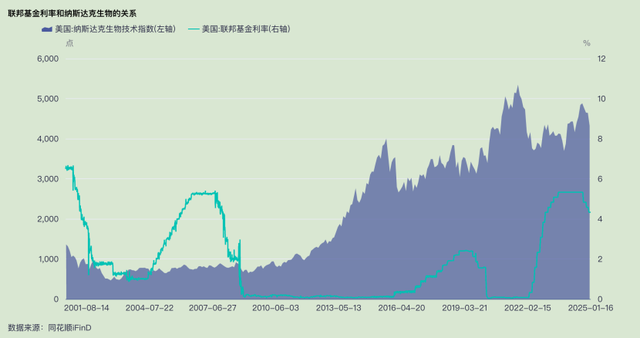 再来看美国联邦基金利率和纳斯达克生物指数,2004年、2016年和2022年这三波加息都直接导致生物科技指数的走弱,呈明显的负相关关系。比较明显的就是2022年之后的这一波收紧,全球生物科技指数陷入杀估值。而在2008年,2020年的这两次降息,也明显刺激了生物科技指数的上涨(叠加疫情)。