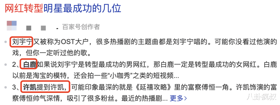 而在百度上搜她,她的标签已经变成了“正儿八经”的演员,之前关于当网红的经历,是一点没写上去。