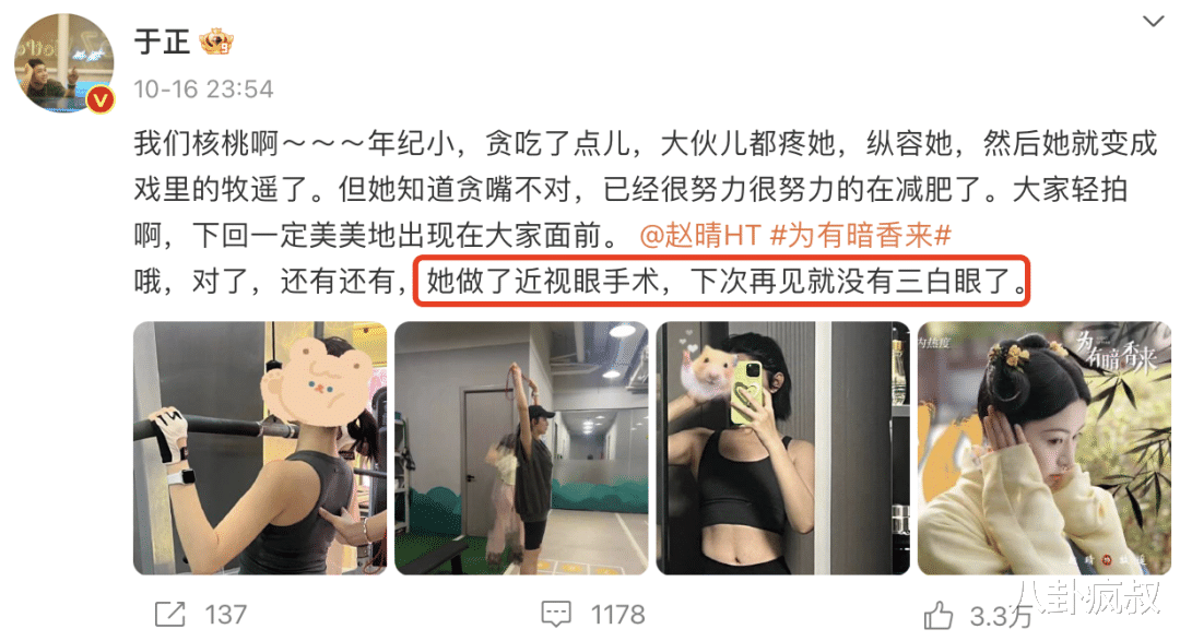 这一次在《为有暗香来》里,她被网友嘲笑扮相臃肿兼演技差,死丫头也立刻出来回应。说她年纪小拍戏的时候贪吃胖了点,现在努力减肥,并做了近视眼手术以后不会三白眼。