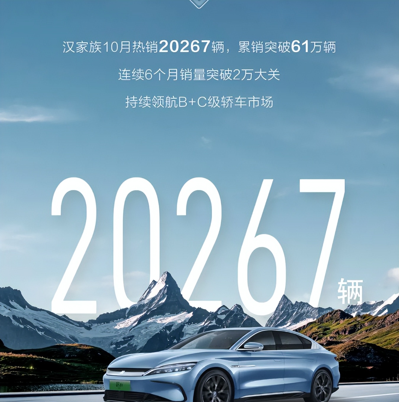 2023年的10月,比亚迪汉再次闪耀登场,以20267台的销量成绩再次引领B+C轿车市场的潮流。而更令人瞩目的是,比亚迪汉累计销量突破了61万台,这不仅是一款车型的成功,更是对比亚迪品牌在新能源领域的强大实力的有力印证。