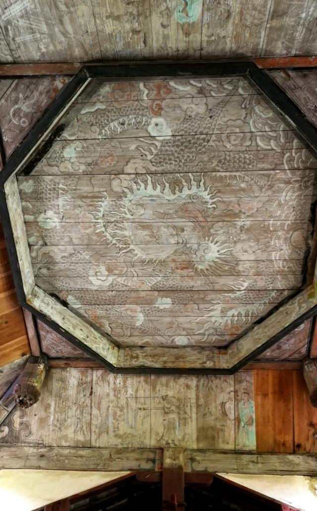 当心间施八角藻井,为覆斗形的窟顶,下设有四个雕花垂莲柱,桥两侧歌山顶下为四角藻井,保留了方井套叠框架结构。藻井上通体彩绘,绘有两龙戏珠图。