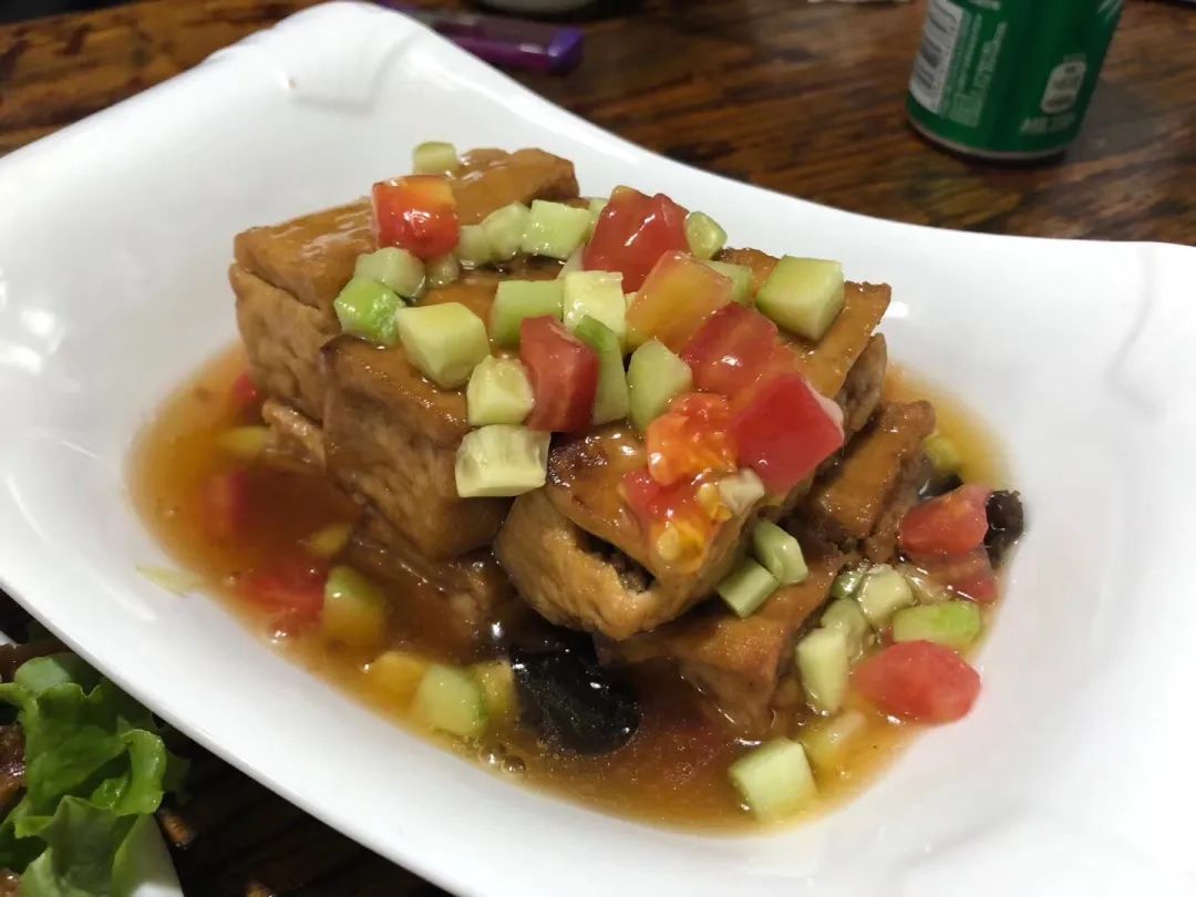 轻咬一口,皮韧馅嫩,豆腐和内馅儿的咸香完美融合,和外层挂的浇头巧妙搭配,香而不腻,回味无穷……