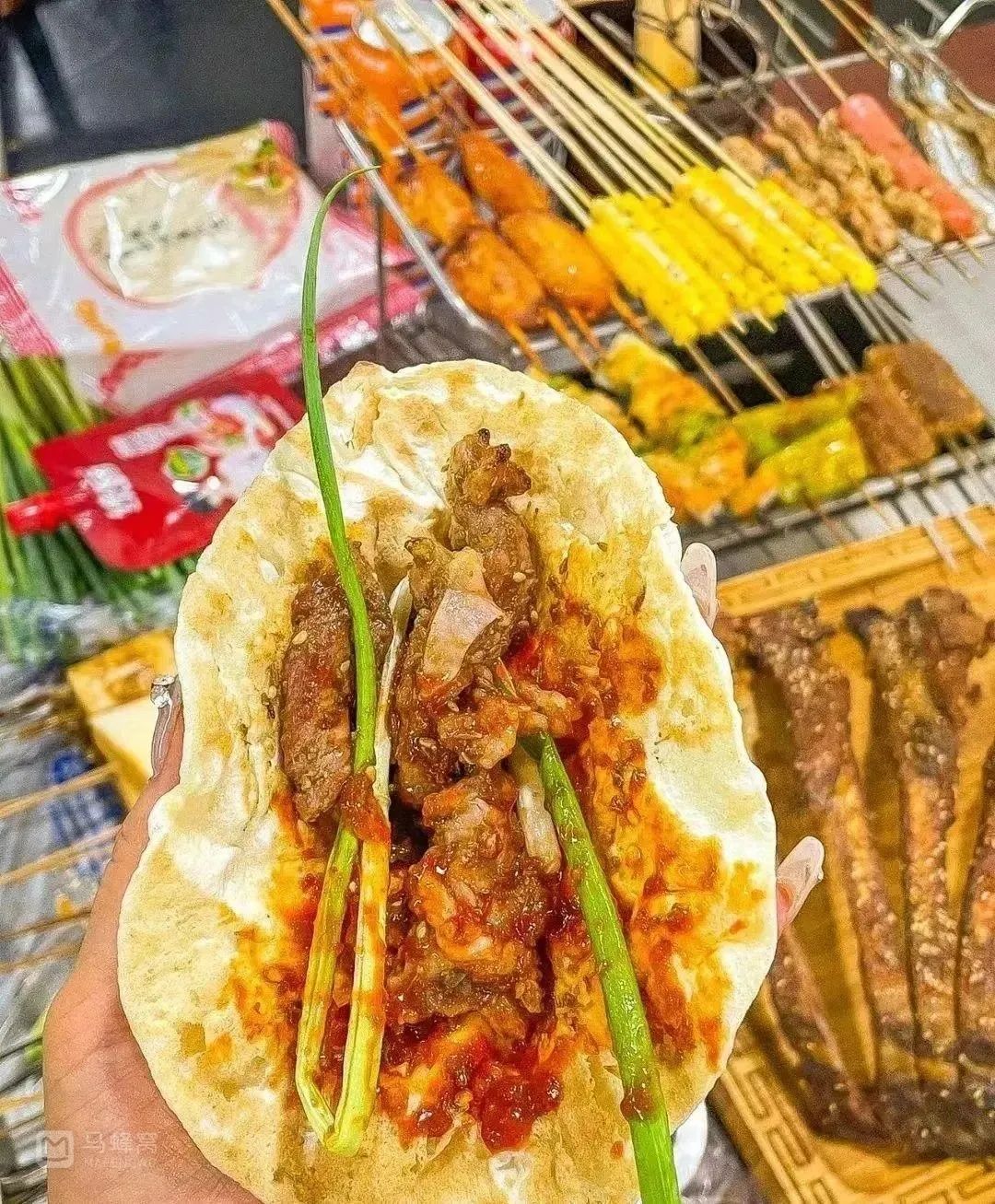 一口咬下去,五花肉的焦香,辣酱的蒜香,花生芝麻的坚果香,还有孜然、椒盐的丰富味道在小葱的助推下直冲味蕾,层次感分明,各种味道又融合的恰到好处。怪不得让这么多人吃上瘾。
