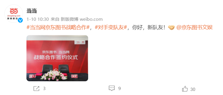 1月10日,京东图书和当当网宣布签订战略合作协议,当当网正式入驻京东。此外,双方还计划在货品、供应链、营销、服务等方面开展深度合作。