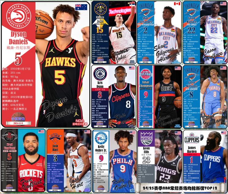 NBA2024/25赛季常规赛已全部结束,本期盘点本赛季常规赛场均抢断榜的前12名球员: