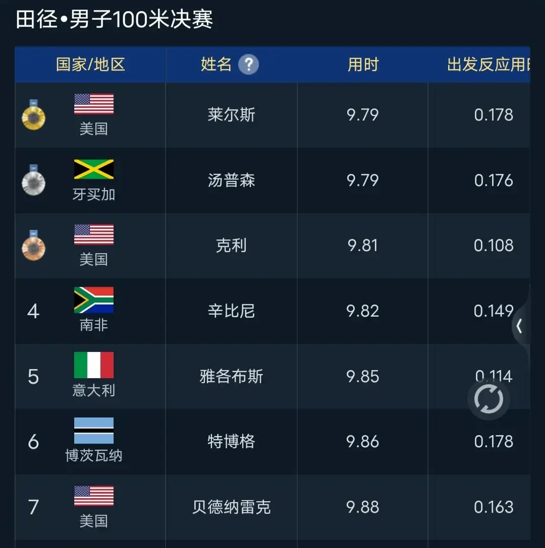 在决赛中,莱尔斯与牙买加选手汤普森、塞维尔以及另一名美国选手科尔利共同展开了激烈的角逐。比赛伊始,科尔利展现出了出色的起跑反应速度,成为了所有选手中起跑最快的。然而,夺冠热门汤普森和莱尔斯的起跑反应相对较慢,分别排在倒数第二位和最后一位。尽管起跑并不占优势,但莱尔斯在比赛过程中逐渐展现出了强大的实力和后劲。