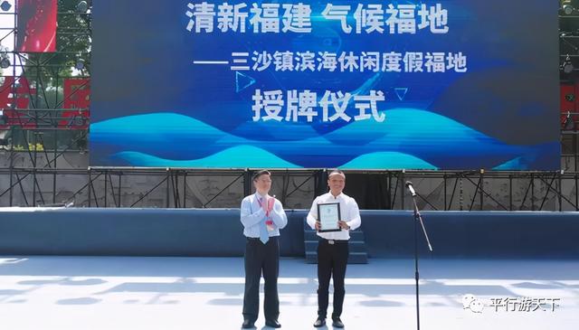 福建省气象局党组成员、纪检组长周述学向气候福地三沙镇授牌