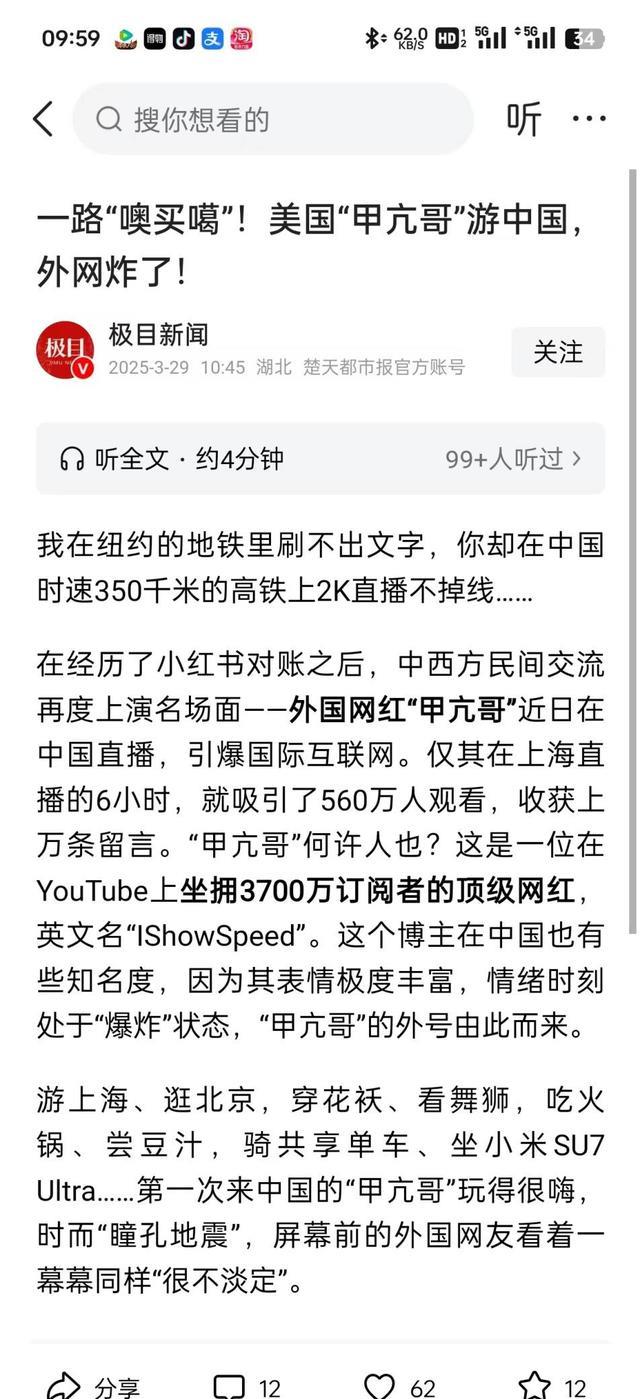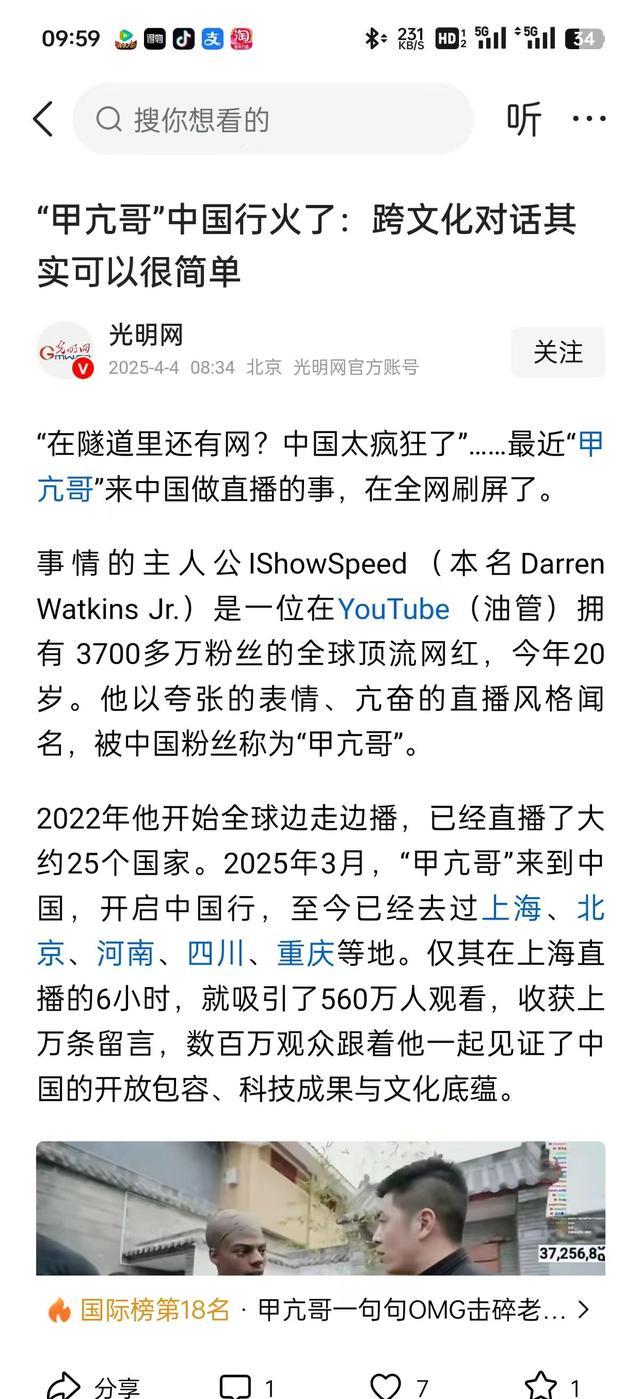 信息源:极目新闻发布的“一路“噢买噶”!美国“甲亢哥”游中国外网炸了!”的报道。