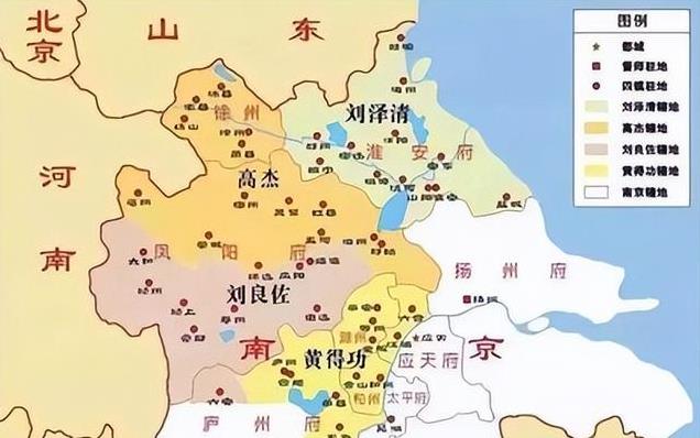 弘光朝出力最大,也是掌握兵权最多的有五人,分别是镇守徐泗的兴平伯高杰;镇守观阳、寿州的广昌伯刘良佐;镇守淮扬的东平伯刘泽清;镇守滁州、和州的靖南伯黄得功(合称江北四镇),以及控遏南京上游,拥兵八十余万的左良玉。