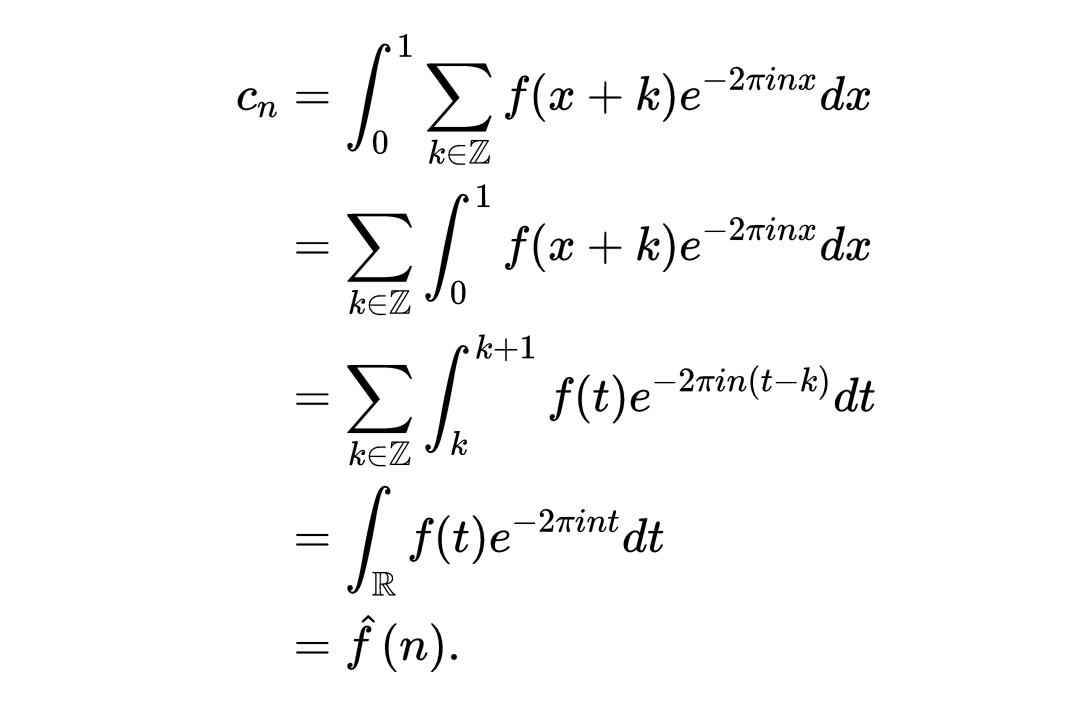 右边的和是f的傅里叶变换在整数上的值。让我们定义一个well-behaved函数f的傅里叶变换为积分,