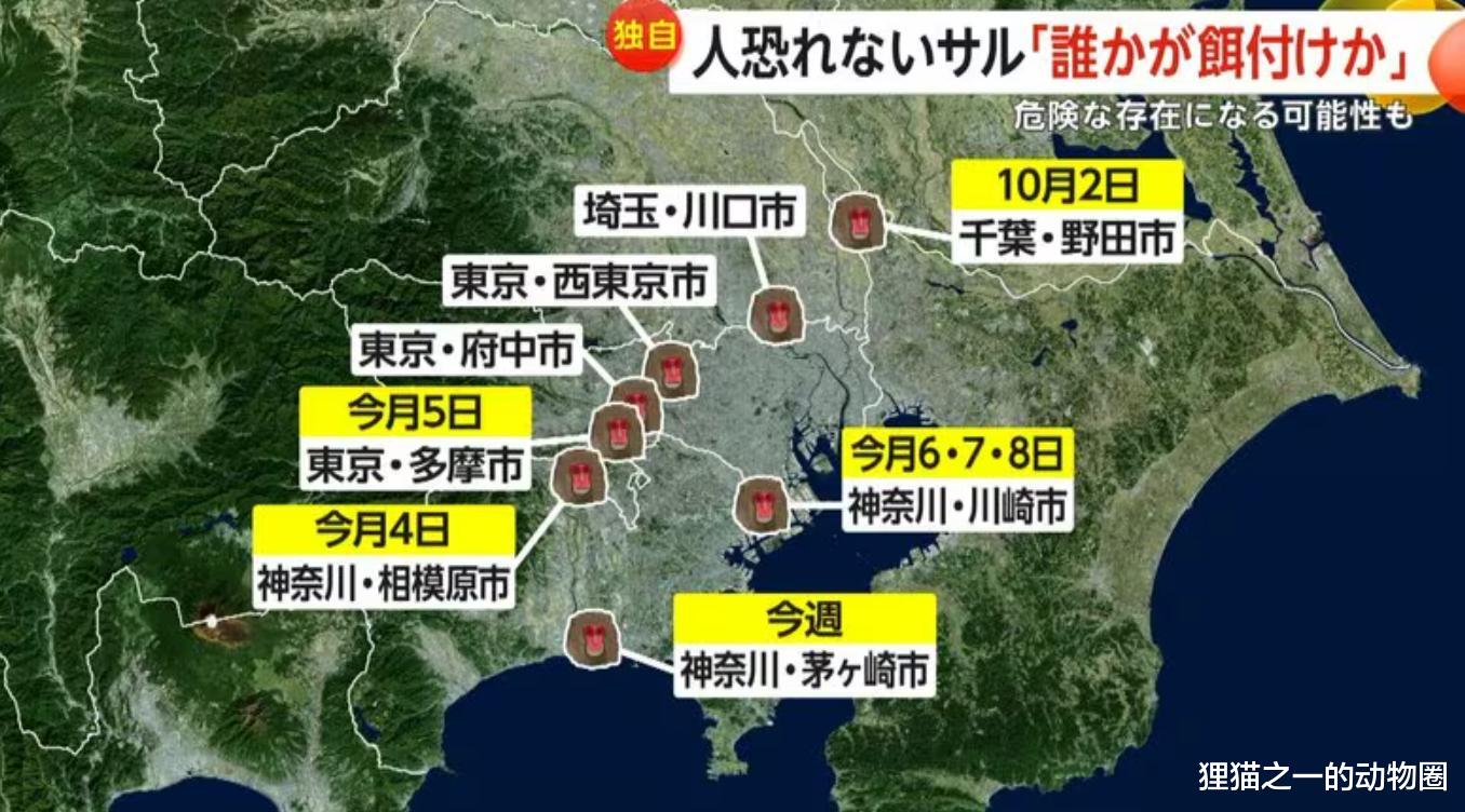 最近这段时间,几乎每天都会被发现这只猴子的目击报道,有时候一天能有好几次。3月初的时候,甚至有一天内看到了它20多次的记录。而这只猴子最早被人们发现,还得再往前追溯,得追溯到2024年10月2日,它首次在千叶县野田市被发现后,便开始在东京都、西东京市、府中市、多摩市等地活动,2025年1月起,又在神奈川县相模原市、川崎市、茅崎市等地被发现。