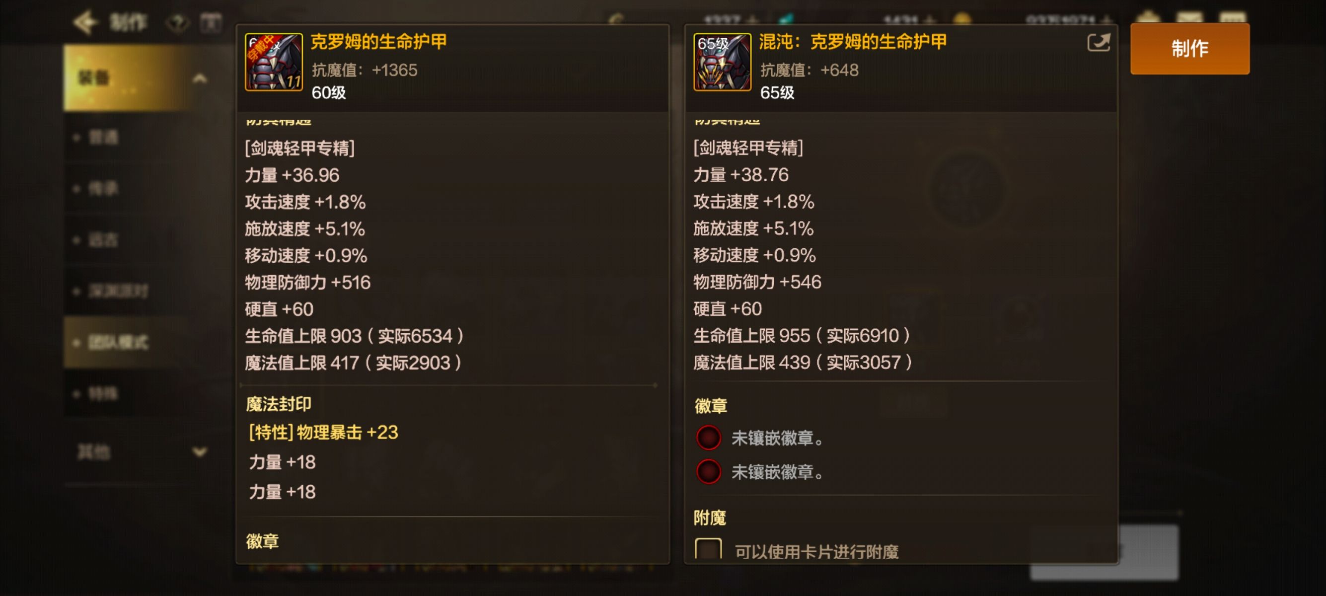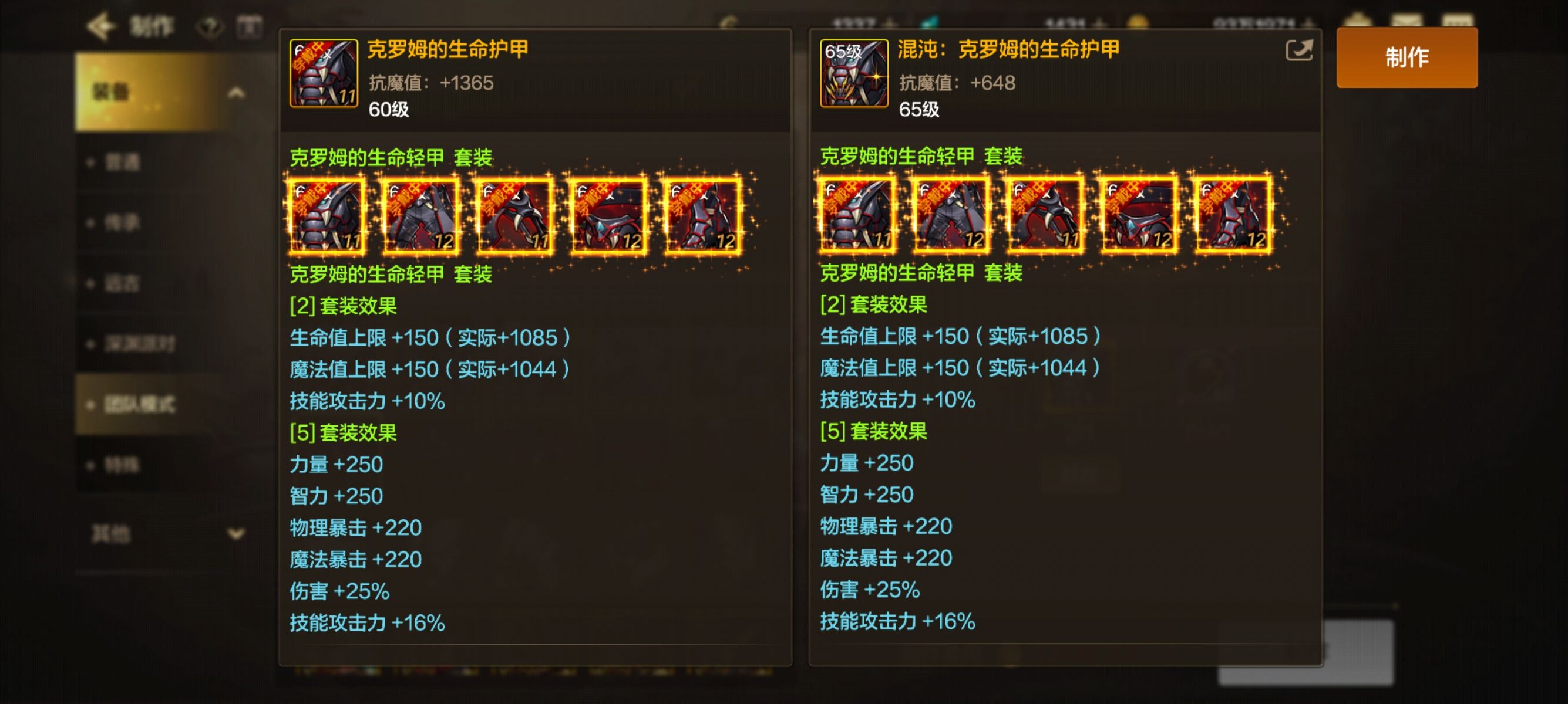 下面就是给大家参考一下,所有防具升级混沌防具的属性面板!