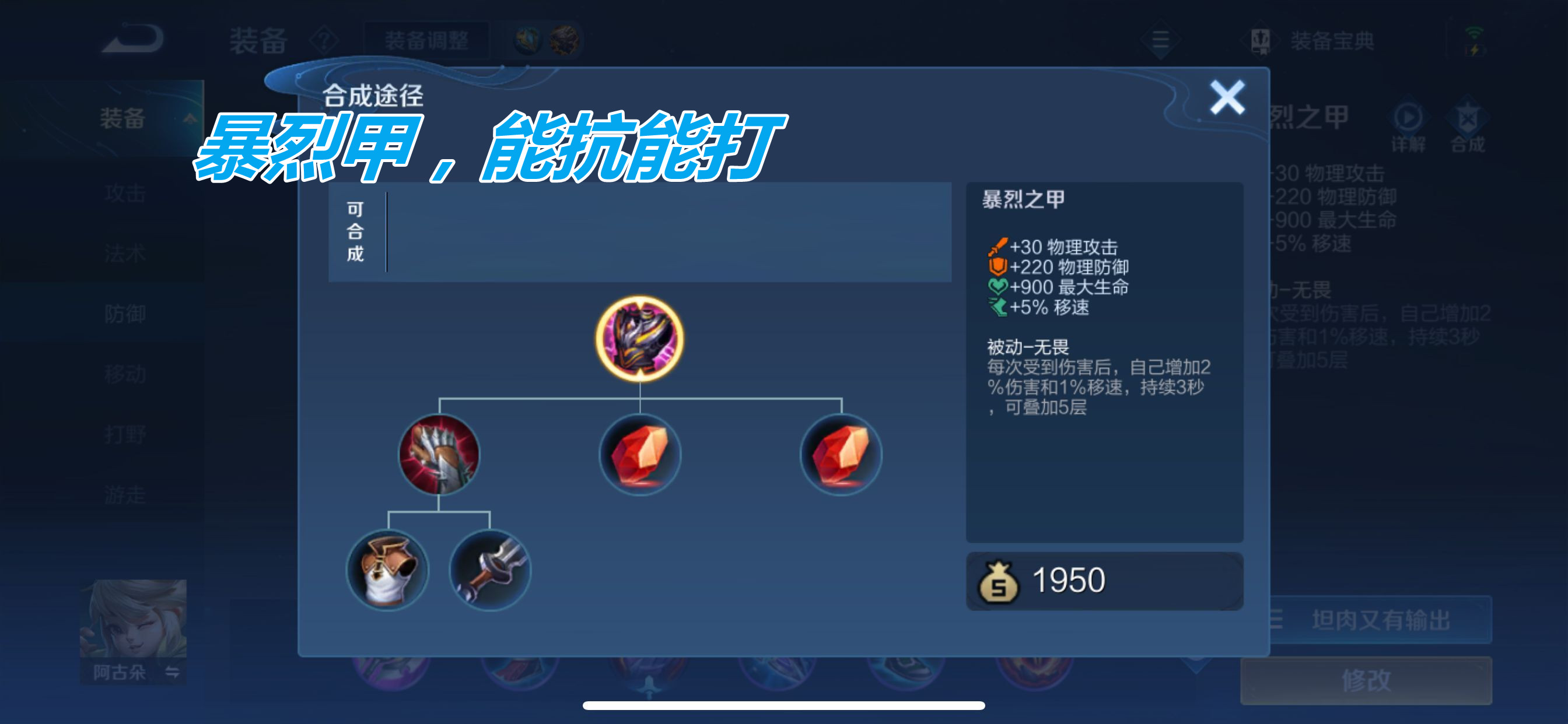 暴烈之甲,是能抗能打的装备,属性是受到伤害会提高移动速度,还有伤害加成,适合大部分对抗路英雄,还有打野出。