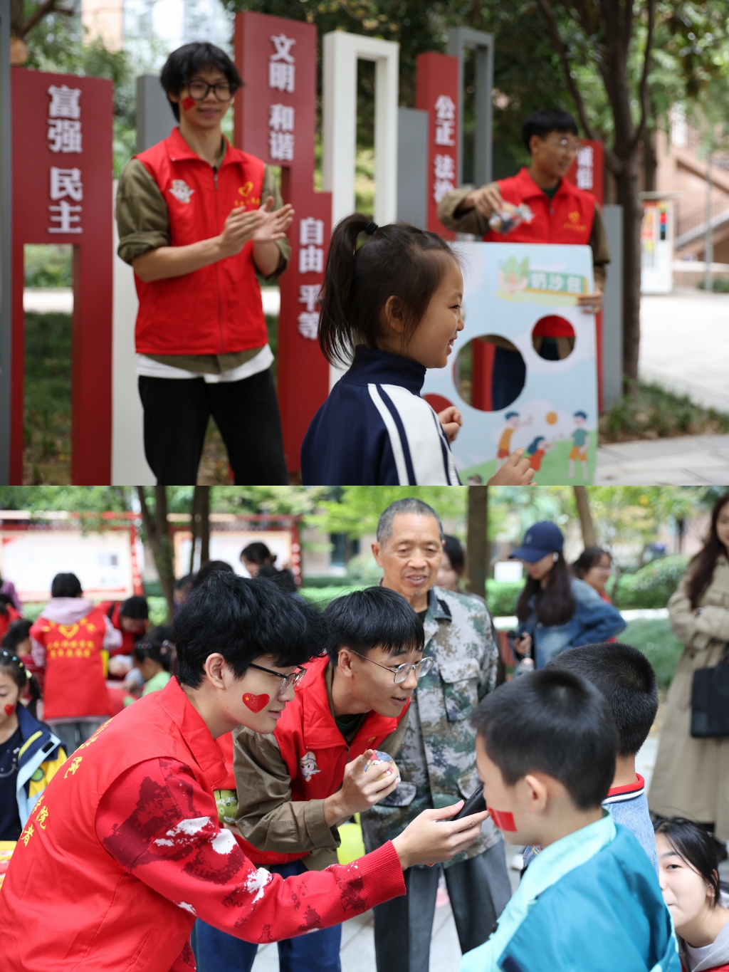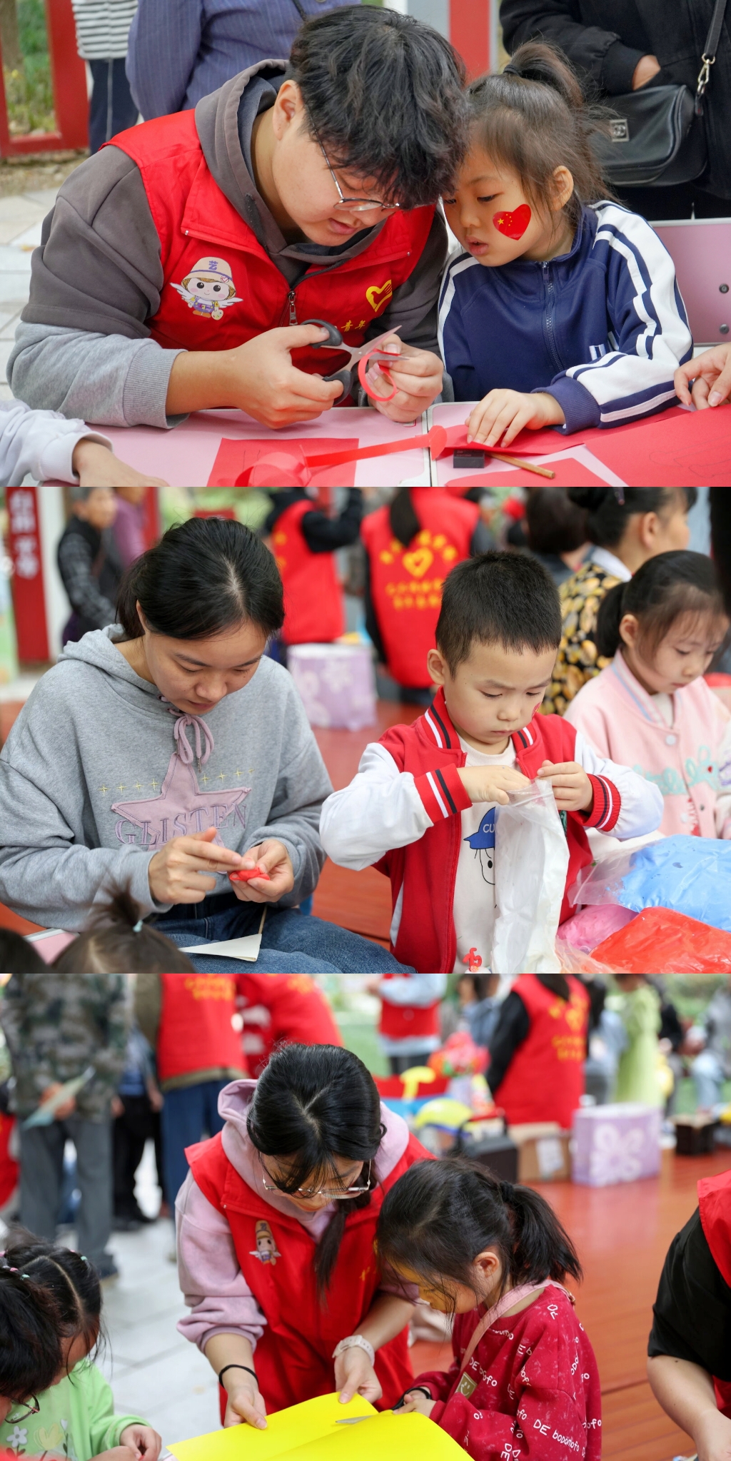 手工组的小朋友们拿着五颜六色的卡纸画上喜欢的手环图案,并由志愿者用剪刀裁剪出来为小朋友戴在手上。小朋友们他们发挥自己的想象力和创造力,全神贯注地投入到绘制旗帜当中,他们将手中的黏土变成了独一无二的作品。知识竞答组的志愿者每念出一道题目,便有小朋友们迅速高举小手,争着抢答。如遇到较困难的题目时,志愿者们则会给予提示,引导小朋友们思考。回答正确的小朋友来到扔沙包区域,累积一定分数可以换取对应的小奖品。活动现场充满了欢声笑语,气氛热烈而温馨。