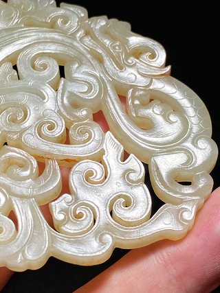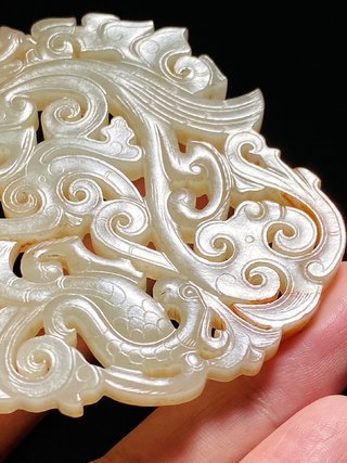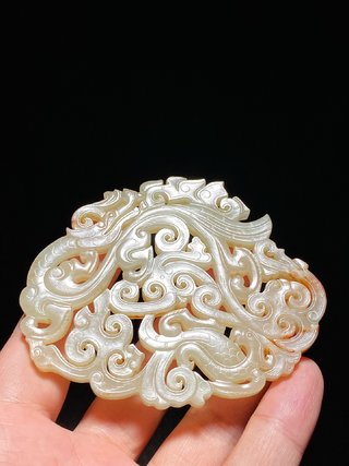 战汉 熟坑 和田玉籽料 白玉 龙凤纹 玉珮 长9 宽0.6 高7.4厘米 重64.1克 玉佩以白玉为材,玉质柔润细腻,光气纯熟,局部带红褐沁色,适合盘玩;整体带有楚式玉器风格,线条纤细修长而不失繁复华丽。玉佩镂空透雕,连体扁平状;龙张口翘鼻,上唇内卷,其下有须,头上有角,挺胸,龙身已成勾连状十分抽象,肩上三层羽翼;凤圆眼尖钩噱,头上有冠,肩部琢三层羽翼,龙凤威武肃穆。本佩饰带有强烈的战汉时期风格,是一件极为珍稀的玉佩珍品。