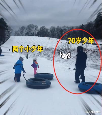 张纪中的两个孩子拖着轮胎走在前头,迫不及待的想玩滑雪,张纪中则是步履蹒跚的跟在孩子们身后,虽然文案上写着张纪中是70岁少年,但其实穿着厚重衣服的他在雪地上已经走不动了,一摇一摆的活似一个唐老鸭。