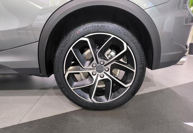 轮辋为20英寸铝合金多边形五辐式,装配马牌MC6系列轮胎,规格245/45 R20。该轮胎强调静谧性与抓地力,优化胎噪,提升制动性能。