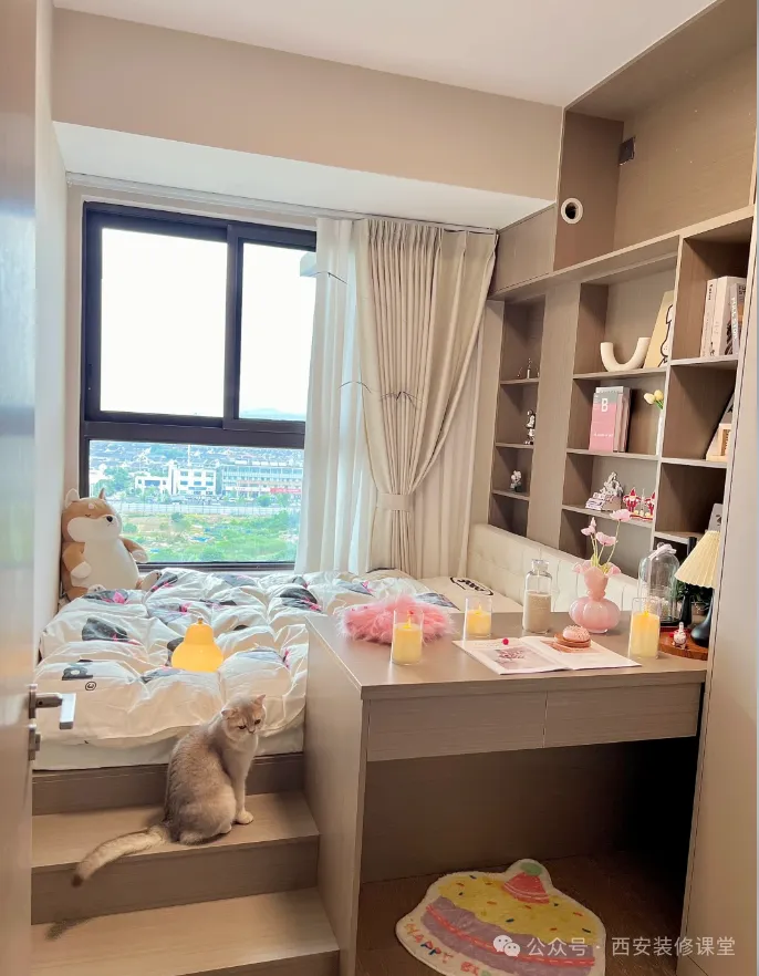 虽然房间小小的只有7平米但功能齐全应有尽有~飘窗加宽做了1.5m 的榻榻米搭配床头靠垫秒变双人床《砸不掉的飘窗与床合并,空间更宽敞》