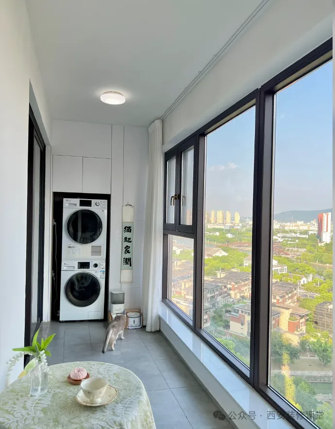 阳台长5.17m,宽1.4m,高2.6m,算是精装改造最多的地方了,主要用来放置洗烘套装以及晾晒、收纳清洁工具,所以阳台以简洁、实用为主