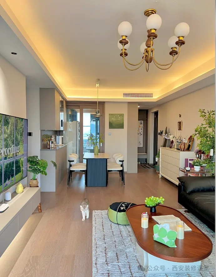 没做复杂的吊顶和电视背景墙棕色茶几搭配复古魔豆吊灯简单装修的小家也可以温馨舒适