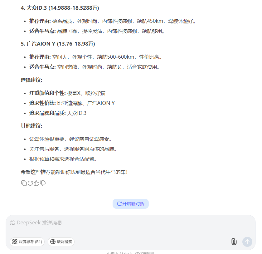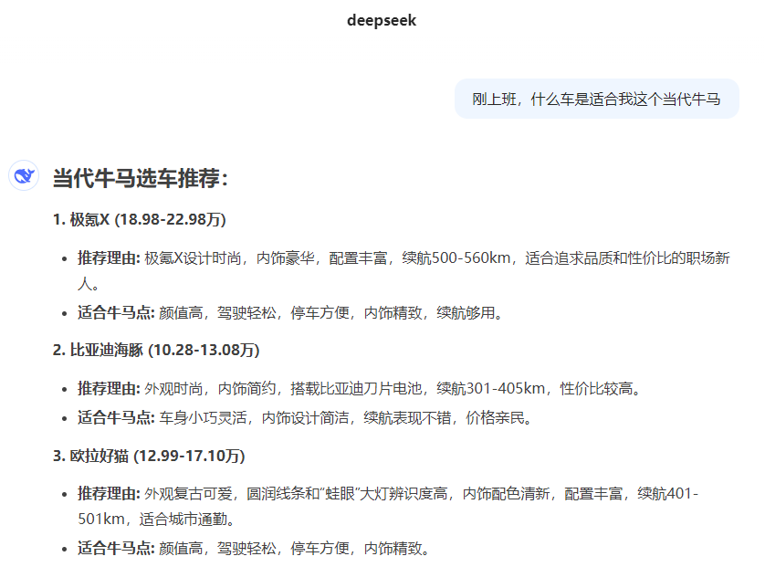 直到最近我问了下DeepSeek,才知道,原来买新能源车也不用花多大的钱嘛