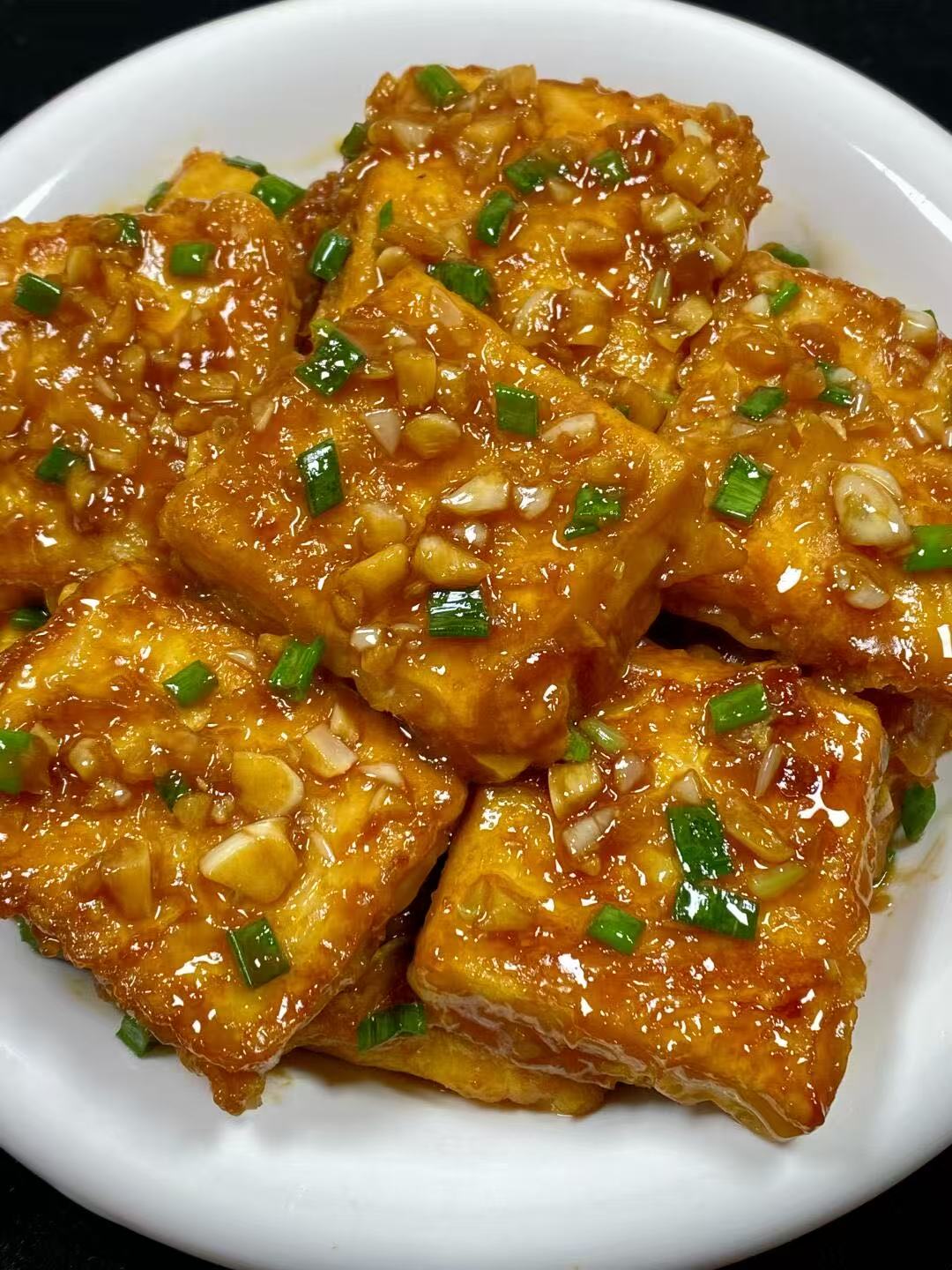 4. 将调好的料汁浇在煎好的脆皮豆腐上,煮至汤汁浓稠,最后撒上葱花即可装盘出锅了。