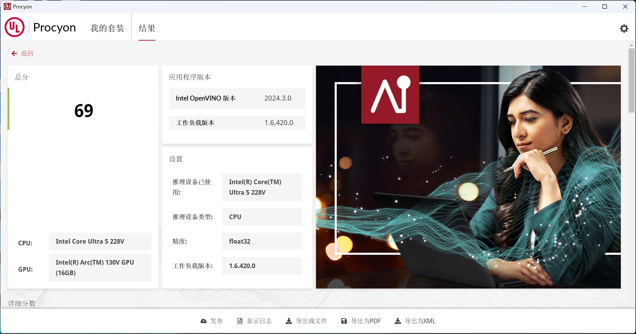 UL Procyon中的AI测试项目中,OpenVINO用于在Intel硬件上优化并部署AI推理,将经过主流深度学习框架训练的神经网络与标准 API 结合使用,然后将其部署于不同的CPU、GPU、NPU中。此项目英特尔酷睿Ultra 5 228V处理器的最终得分69分。