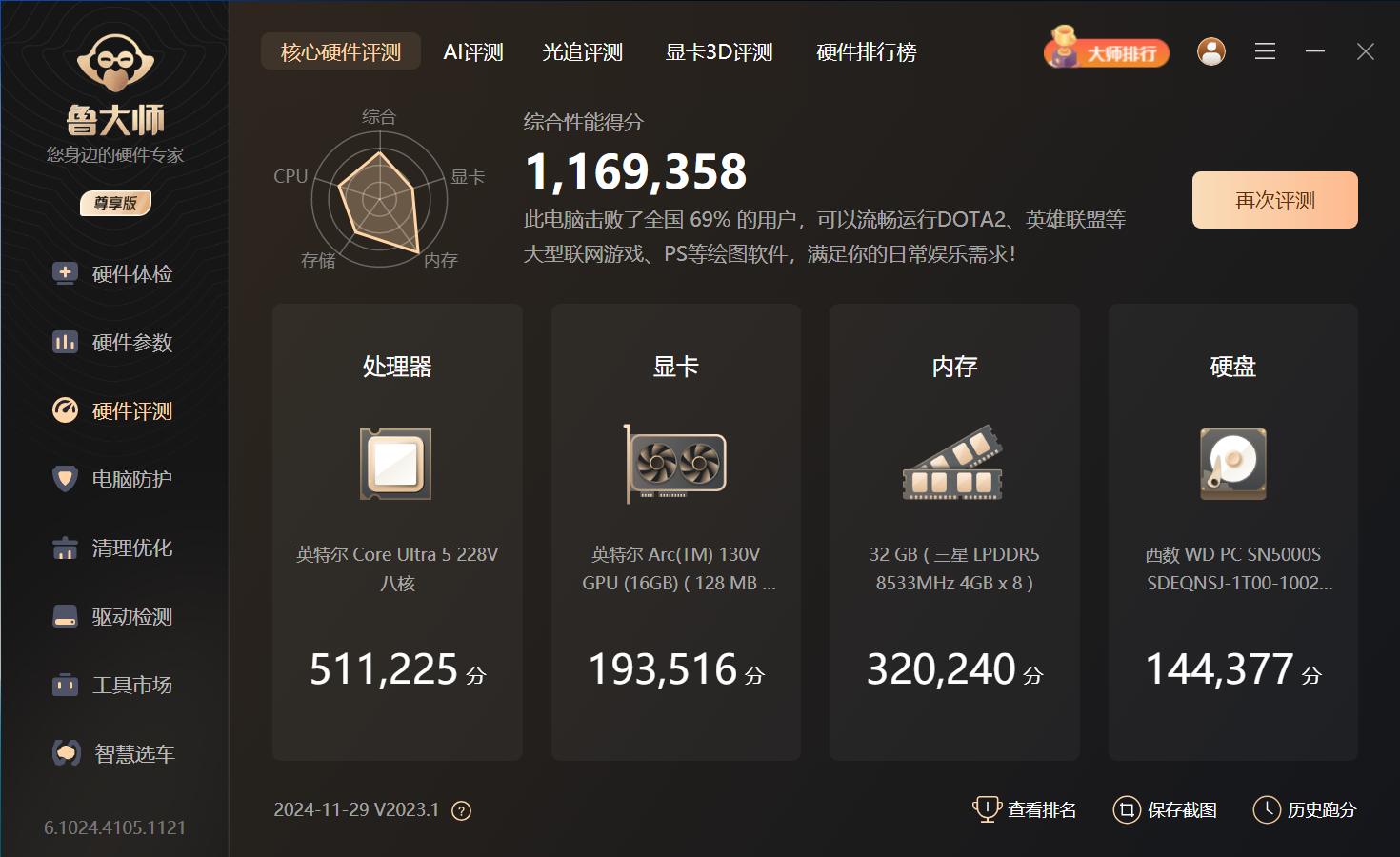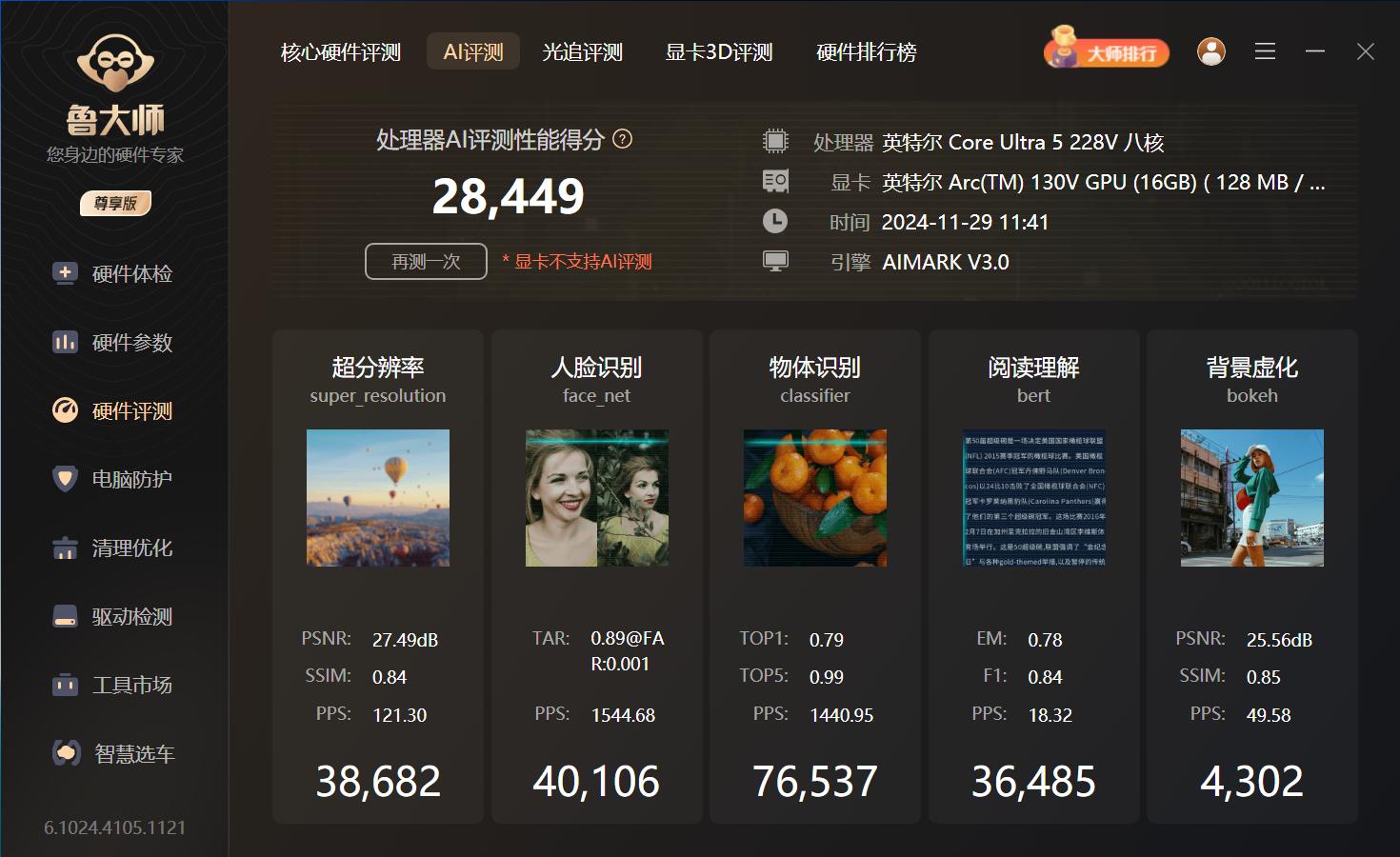 鲁大师处理器AI评测包含超分辨率、人脸识别、物体识别、阅读理解、背景虚化等测试项目,英特尔酷睿Ultra 5 228V的AI性能得分28449。