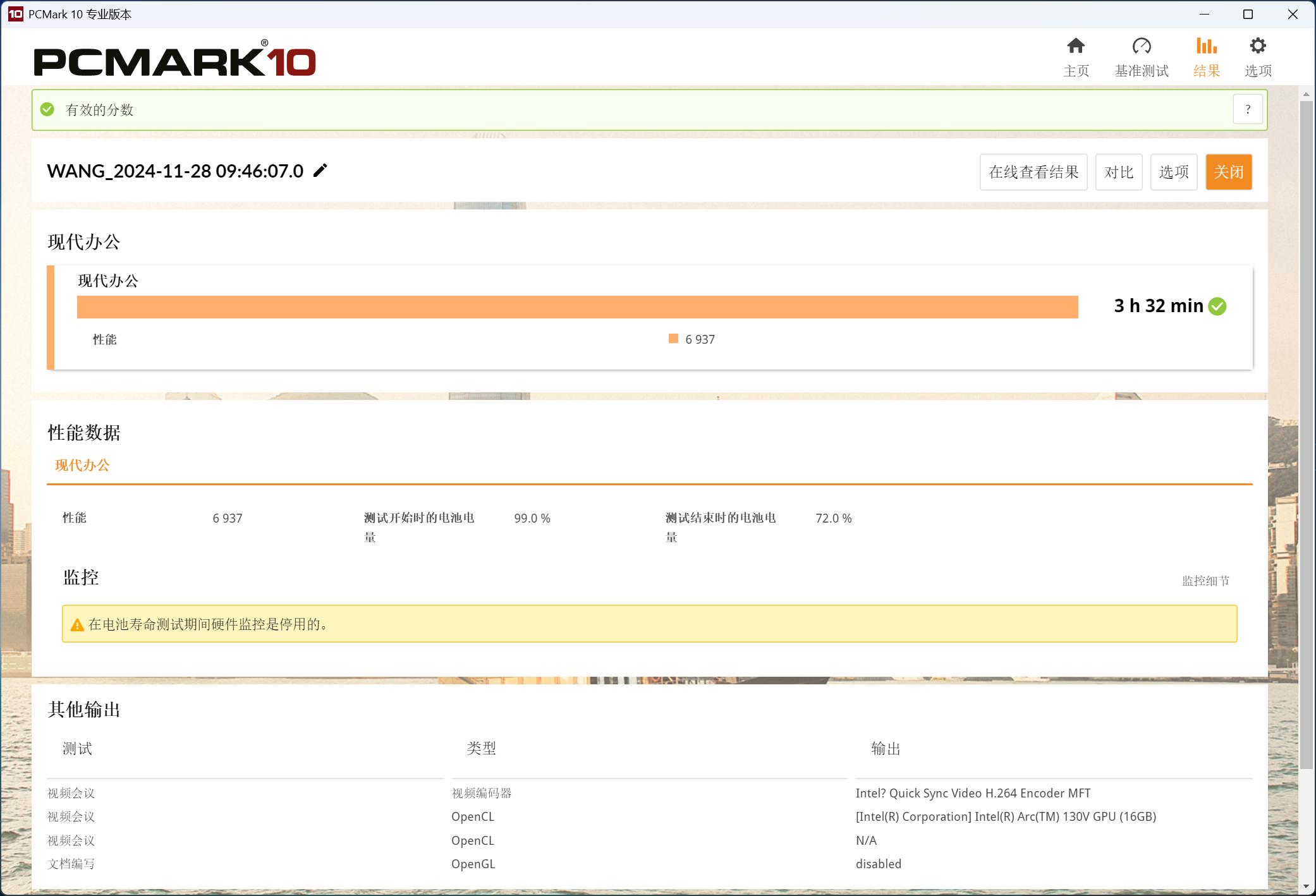 我又使用PCMark10针对现代办公场景进行了续航测试,通过实际平均地运行文件编写、网页浏览和视频会议等任务来测量电池寿命,这些任务间会有短时间的闲置时间作分隔。