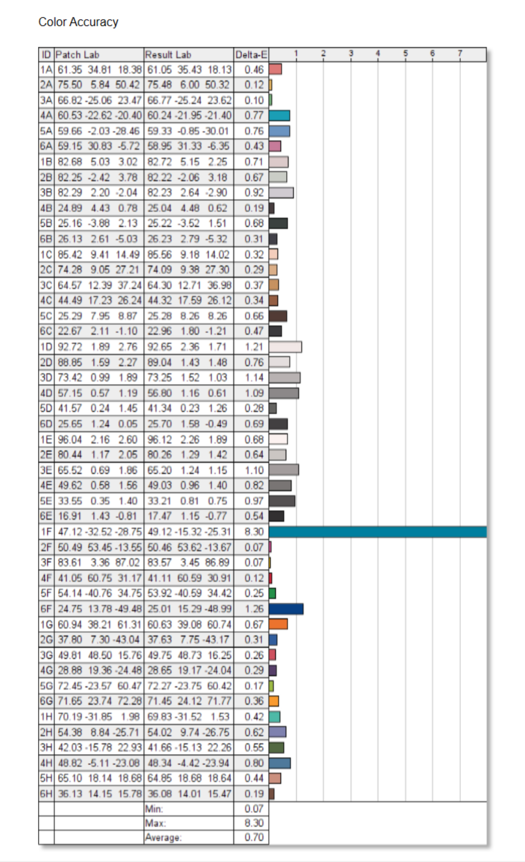 红蜘蛛用ΔE值用来表示显示器色彩还原的精确度,数值越小表示对该颜色的还原越精准。这块屏幕48色ΔE平均值0.7,色彩还原精准度很高,已经达到专业设计师屏幕的标准。