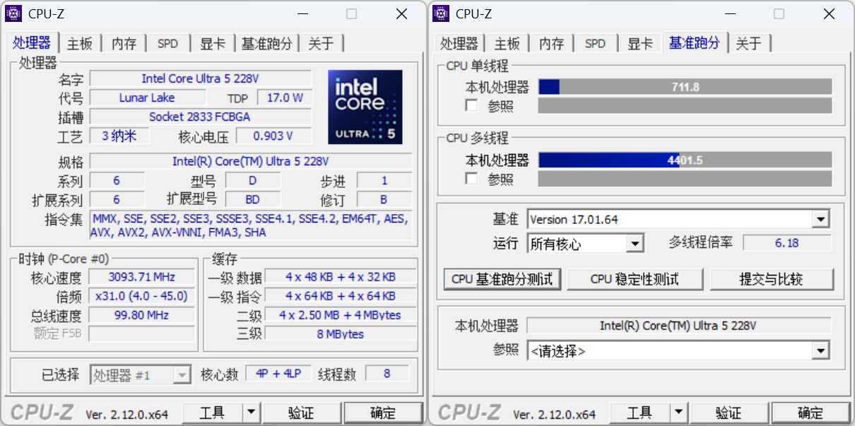 CPU-Z单线程测试711分,多线程测试4401分。