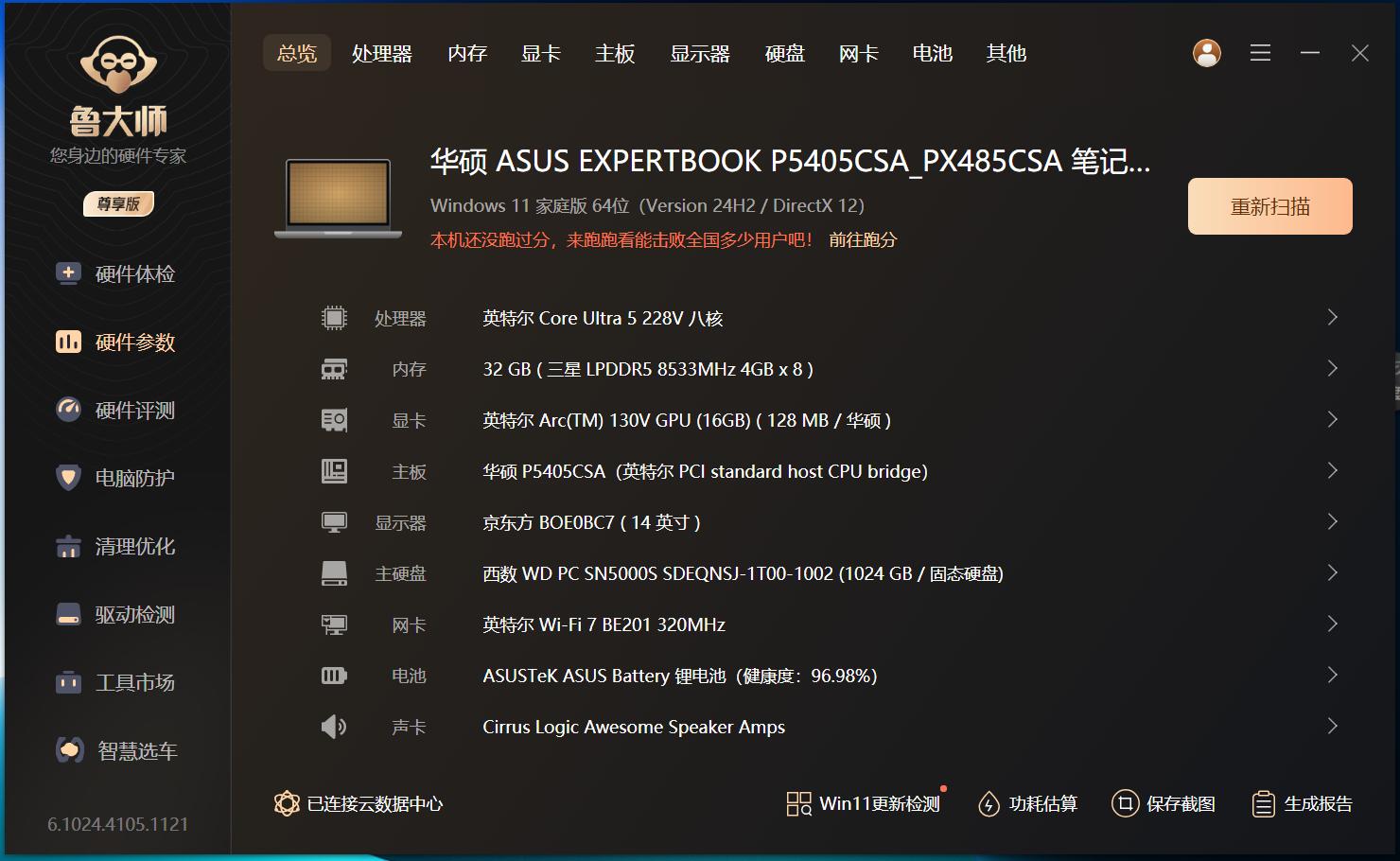 硬件配置方面,华硕破晓6 Pro搭载英特尔酷睿Ultra 5 228V处理器,8核心8线程,最大睿频频率4.5GHz,8MB高速缓存,AI算力97TOPS;GPU为英特尔Arc Graphics 130V。除此之外,它还配备三星LPDDR5 32GB 8533MHz内存以及西部数据1TB PCIe 4.0 SSD。整体来看,这套硬件配置在轻薄本领域可圈可点,除了日常办公,它还能兼顾简单的生产力创作以及娱乐需求。