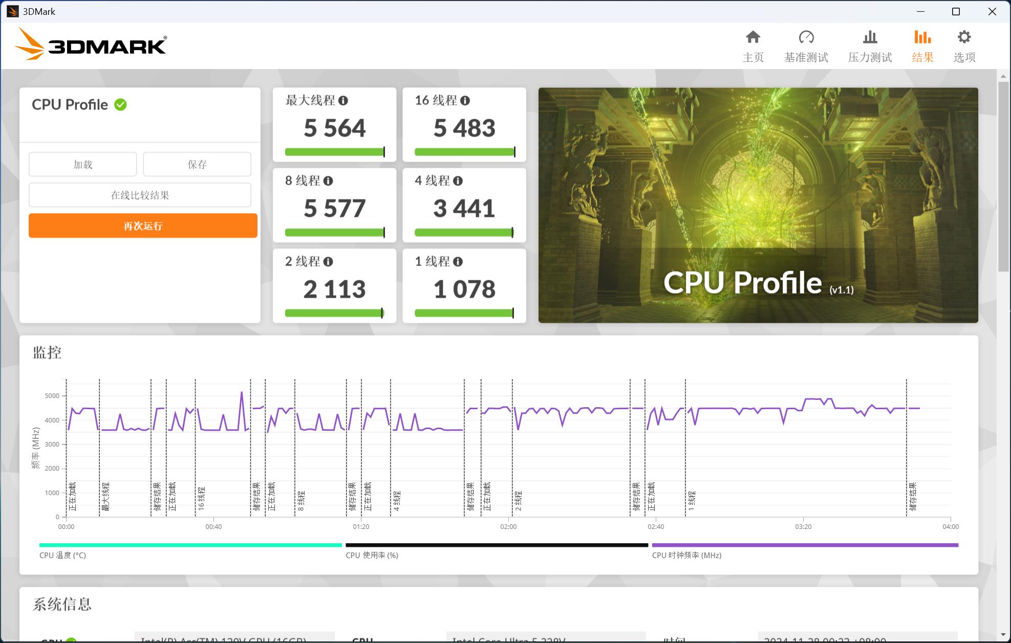 进阶版3DMARK还提供测试CPU不同线程的运算能力,从结果来看,1线程得分1078,2线程得分2113,4线程得分3441,8线程得分5577,16线程得分5483,最大线程得分5564。