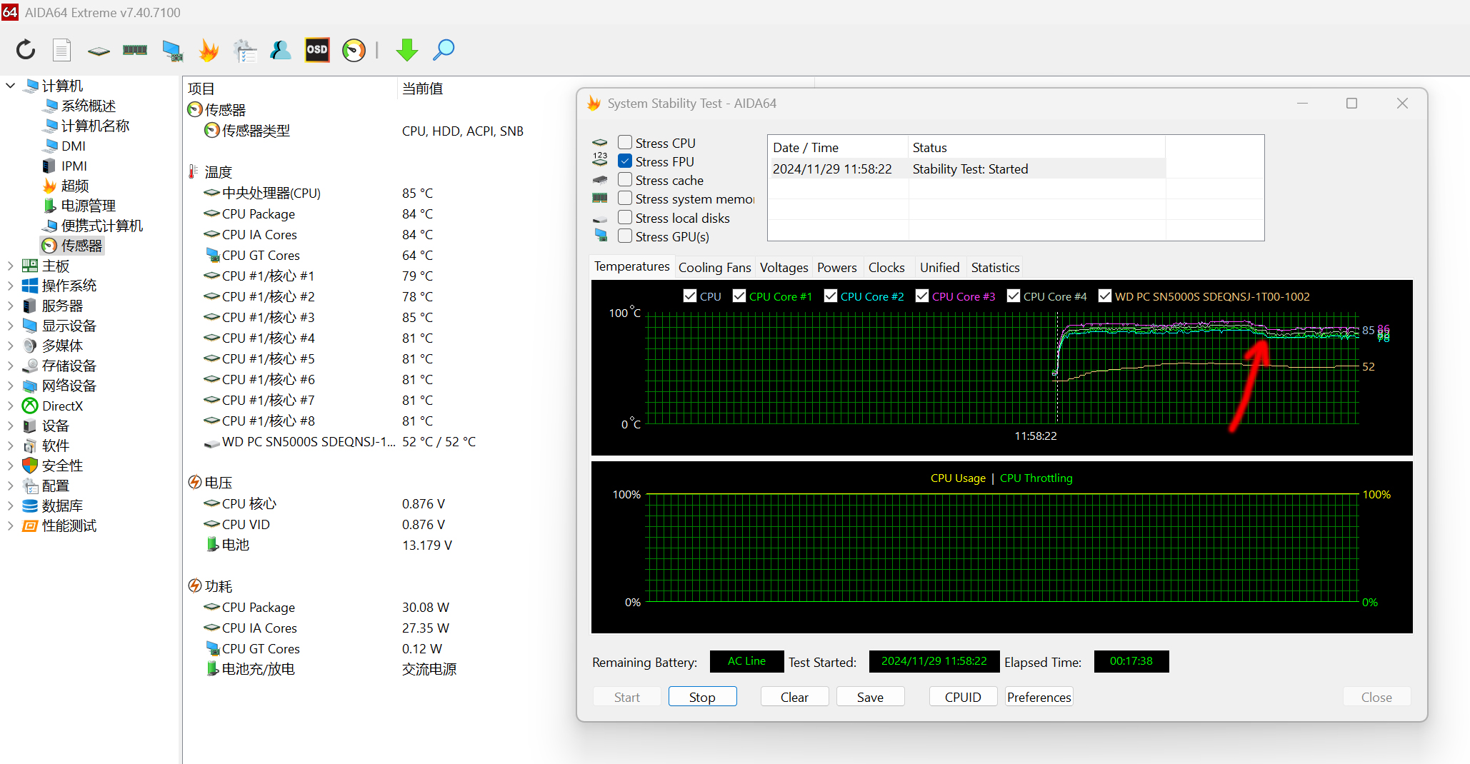 七、散热测试AIDA64 FPU单烤约20分钟,CPU核心温度85℃左右,没有出现降频现象;机身正面温度在C面上端中间位置43.5℃,D面最高温度在散热口位置46℃。