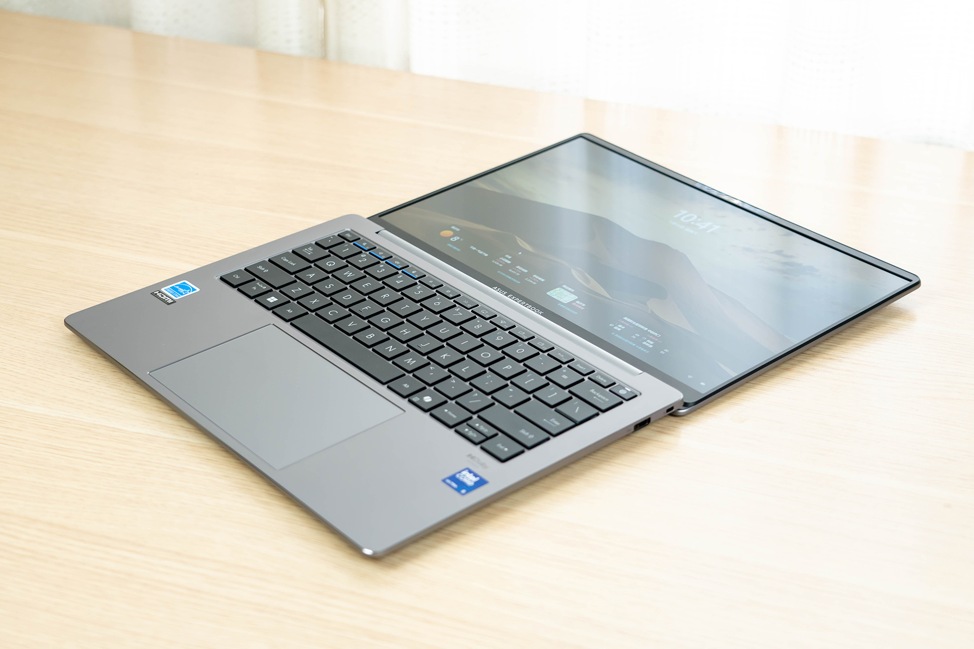 有一说一,华硕破晓6 Pro的外观设计非常符合我这枚理工男的审美。银灰色金属机身,表面是轻微的磨砂手感,A面有一枚印有“ASUS EXPERTBOOK”字母LOGO的金属拉丝铭牌,高级感拉满。整机简约、精致、低调又不失大气,不论在通勤路上还是商务会场中都让我感觉倍有面儿。